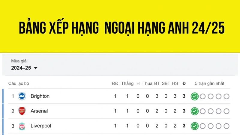 Bảng xếp hạng bóng đá Anh nhanh chóng trở thành nguồn thông tin được người hâm mộ quan tâm nhiều nhất khi theo dõi các trận đấu hàng đầu. Thông qua BXH tại Bsport sẽ dễ dàng nắm bắt được vị trí của từng đội trong giải đấu nhằm hiểu rõ ai có phong độ cao nhất với cơ hội tiếp cận chức vô địch.