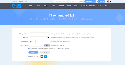 - Bước 2: Lúc này hệ thống sẽ hiển thị 1 giao diện với các ô thông tin đăng ký GI8. Anh em điền đầy đủ các thông tin cá nhân bao gồm: tên đăng nhập, mật khẩu, xác nhận lại mật khẩu, số điện thoại, mã xác minh…